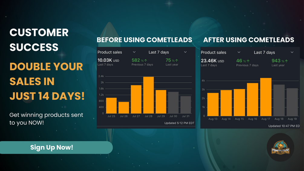 - "I was struggling to find profitable products while having a 9-5 job. Luckily, I found CometLeads through a friend who's also subscribed and had a good experience with their services. I decided to test it out for a month. GOOD LORD! MY SALES WERE UP BY 100%+ IN LESS THAN 20 DAYS!!!! 12/10 recommend this service. --- Anonymous Member"